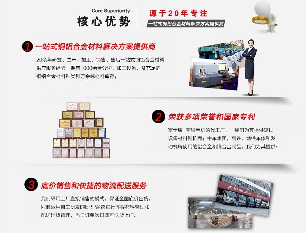 深圳市錦發銅鋁有限公司成立于1998年,注冊資金1億元人民幣,是一家國家高新技術企業,榮獲廣東省著名商標稱號。總部及生產基地位于深圳寶安松崗,占地面積3萬多平方。公司成立以來,一直專注于鋁材、銅材等合金材料的研發、生產加工及銷售。倉儲上萬噸銅鋁合金材料,迅速響應客戶需求。
